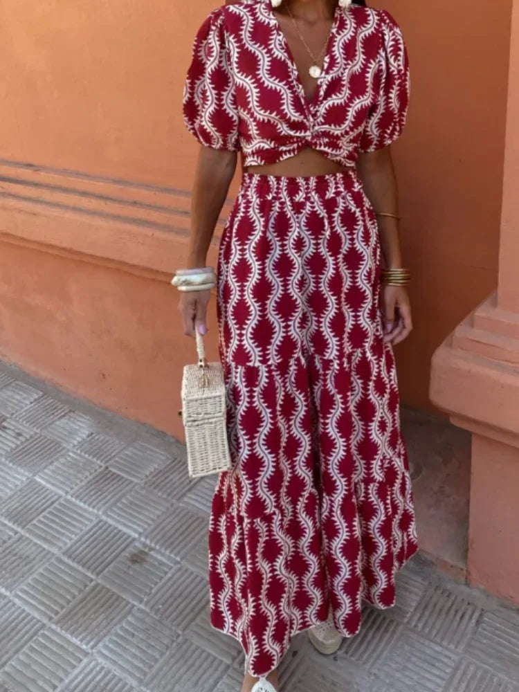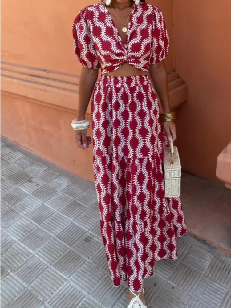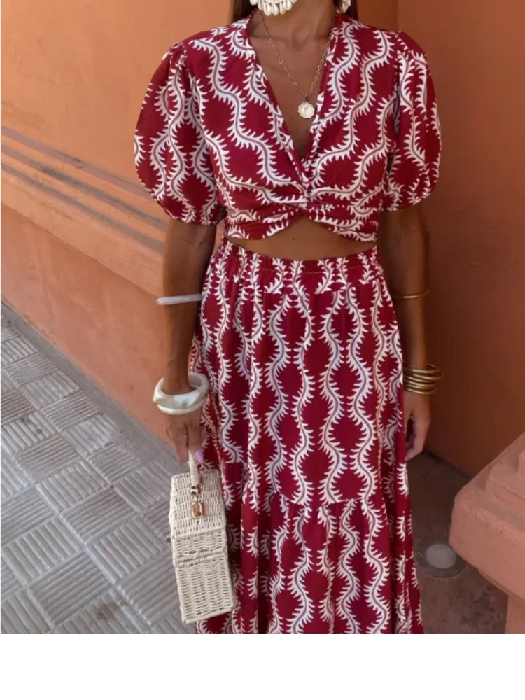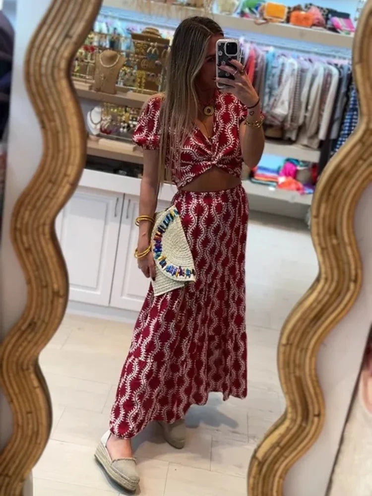 Ben jij al tijden opzoek naar de perfecte set? Eentje die lekker zit en geschikt is voor verschillende gelegenheden, zowel casual als chique. Zoek dan niet verder. Ontdek de Bibi Set: een set met een print en een twist knoop V-hals top. Deze modieuze set voor vrouwen bestaat uit een hoge taille rokje met ruches. Perfect voor de zomer van 2024, straalt deze set chique streetwear stijl uit